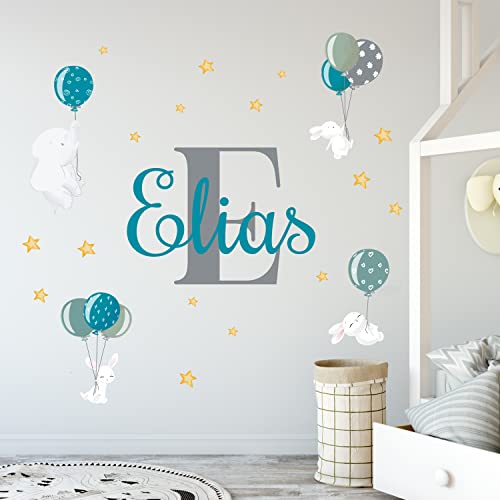 K011 Wandtattoo Kinderzimmer Namen Sterne Set Punkte Türschild Baby Mädchen Junge Mix personalisiert Wunschname Babyzimmer Wandgestaltung verschiedene Größen (06 Hasen mit Ballons Blau)