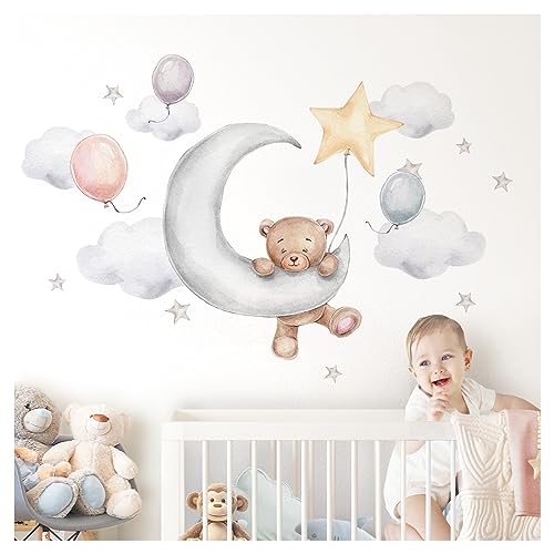 Little Deco Wandsticker Bär auf dem Mond mit Luftballons Wandtattoo für Babyzimmer Teddybär Sterne Wandaufkleber Kinderzimmer Deko DL829-2