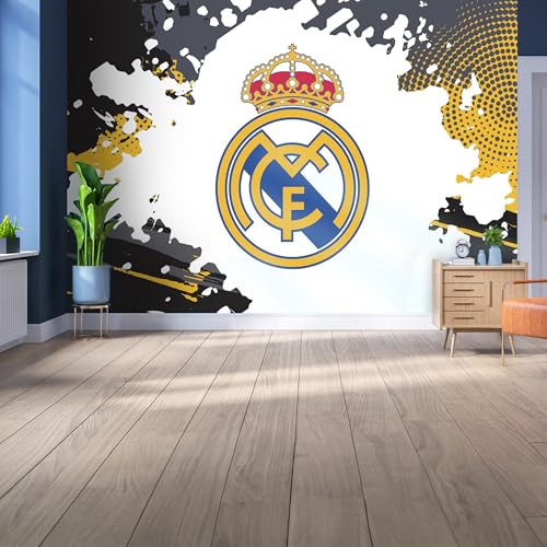 Lizenziertes Decor Real Madrid Vinyl-Wandbild, klein, 110 cm (H) x 80 cm (H), komplettes Wappen auf Farbspritzern, Schwarz und Grau und Gelb