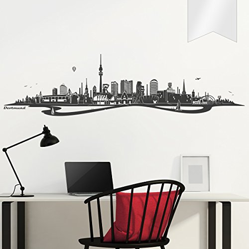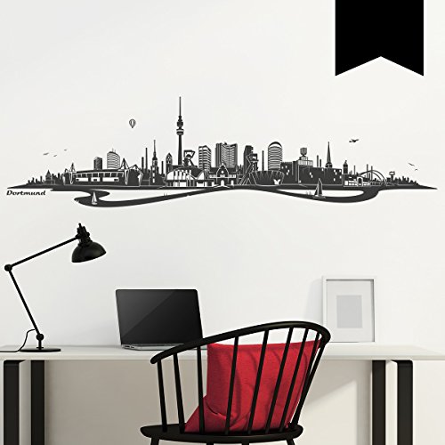 WANDKINGS Wandtattoo - Skyline Dortmund (mit Fluss) - 300 x 77 cm - Schwarz - Wähle aus 6 Größen & 35 Farben