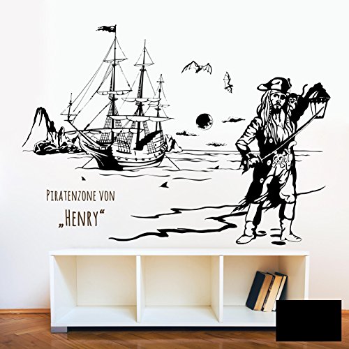 Wandtattoo Wandaufkleber Piratenzone Piratenschiff Pirat Pirateninsel Meer Seeräuber Wunschname Name M1643 - ausgewählte Farbe: *Schwarz* [...]