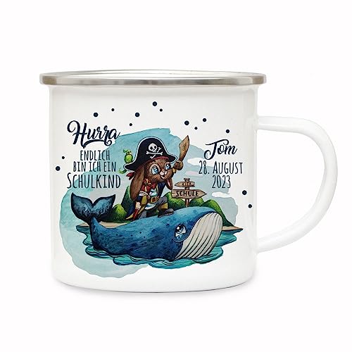 ilka parey wandtattoo-welt Emaille Becher Einschulung Tasse Trinkbecher Pirat mit Wal Spruch Hurra endlich Schulkind Wunschname + Datum [...]