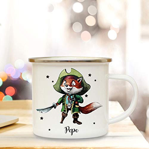 ilka parey wandtattoo-welt Emaillebecher mit Pirat Fuchs & Name Wunschname Campingtasse mit Füchschen Kaffeetasse Geschenk eb249