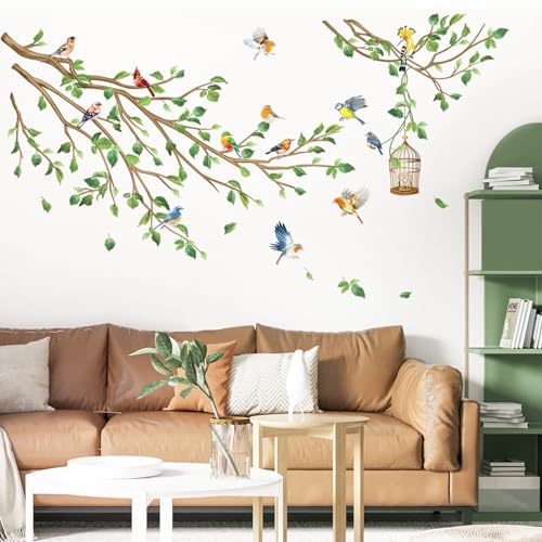 decalmile Wandtattoo Vögel auf Baum Ast Wandaufkleber Grüne Blätter Zweige Wandsticker Schlafzimmer Wohnzimmer Sofa Hintergrund Wanddeko