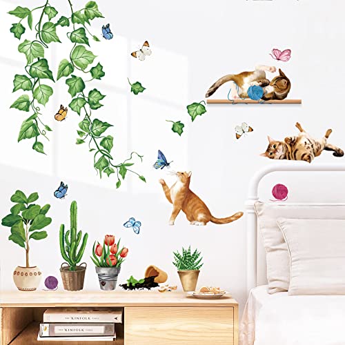 wondever Wandtattoo Hängende Rebe Wandaufkleber Grüne Topfpflanze Katzen Wandsticker Wanddeko für Wohnzimmer Schlafzimmer Küche
