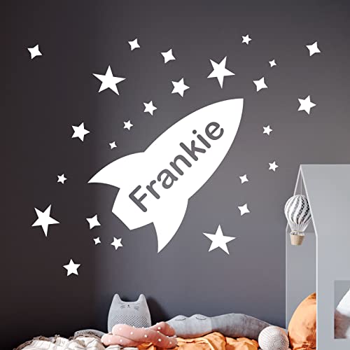 Wandtattoo Rakete mit Sternen – Jungen-Schlafzimmer personalisierbar Name [Weiß]