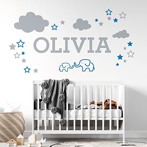 Wandtattoo mit Namen, Elefanten, Wolken und Sterne, personalisierbar [Ozean]