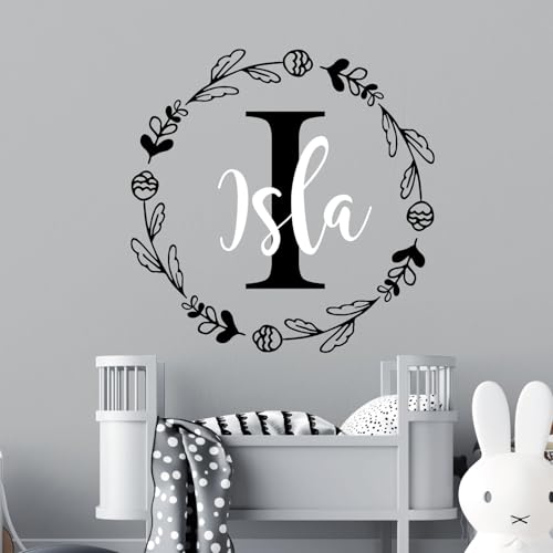 Personalisierter Name mit Initiale im Blumenkranz - Wandtattoo Kinderzimmer [schwarz]