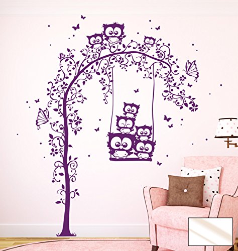 Wandtattoo Eule Eulen Eulenaufkleber Baum mit Eulen Eulenbaum Eulenschaukel Eulen auf der Schaukel M1024 (XXL 105cm hoch x 115cm breit)