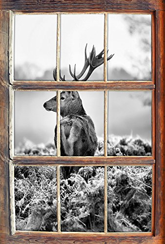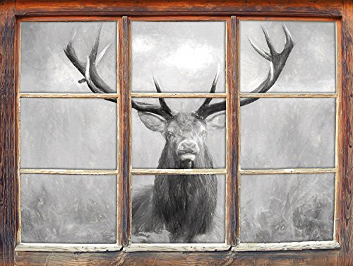 Monocrome, Stolzer Hirsch Fenster im 3D-Look, Wand- oder Türaufkleber Format: 62x42cm, Wandsticker, Wandtattoo, Wanddekoration