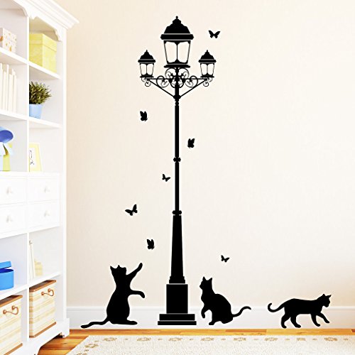 Wandtattoo Straßenlaterne Katzen Schmetterlinge 188 cm hoch x 145 cm breit/schwarz