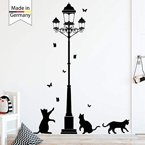 Wandtattoo Straßenlaterne Katzen Schmetterlinge 188 cm hoch x 145 cm breit/schwarz