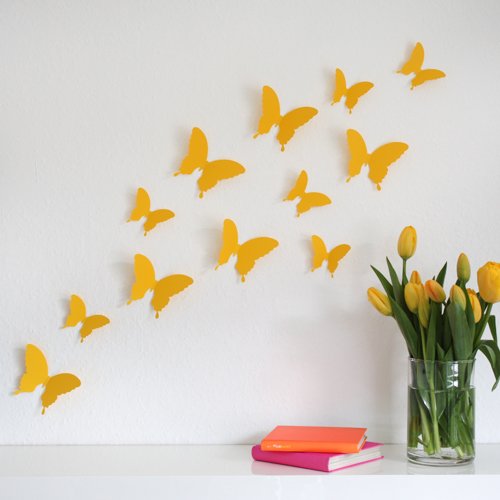 Wandkings Schmetterlinge im 3D-Style in GELB, 12 Stück, Wanddekoration mit Klebepunkten zur Fixierung